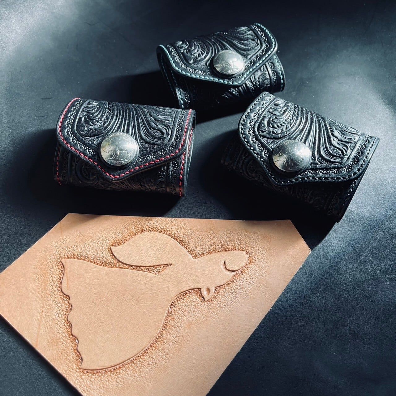 素材にはハーマンオーク社製の最高級ヌメ革を用い、留め具にはアメリカンバッファローとインディアンのコインコンチョを使用しました。